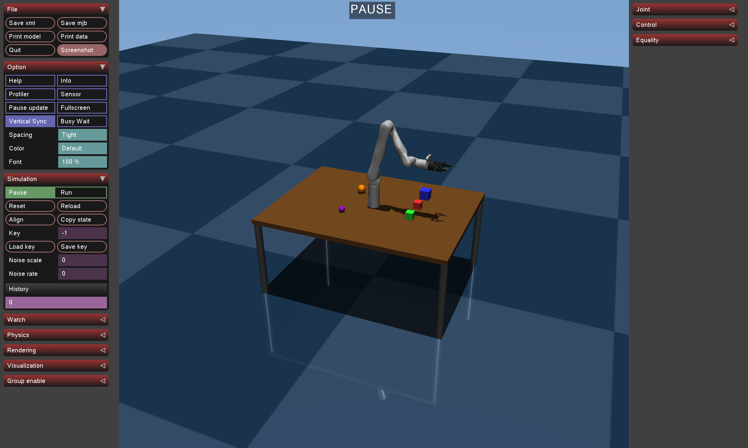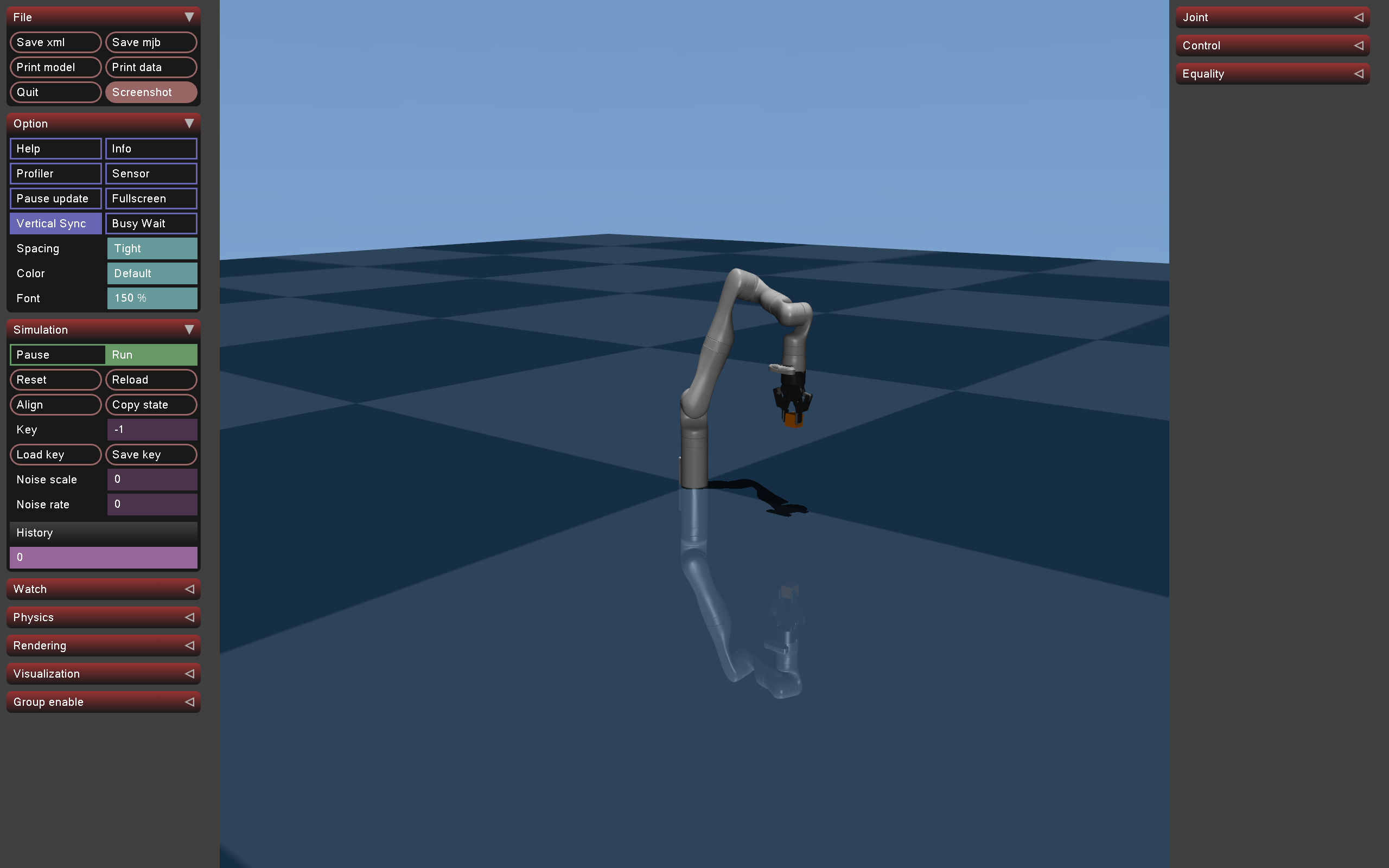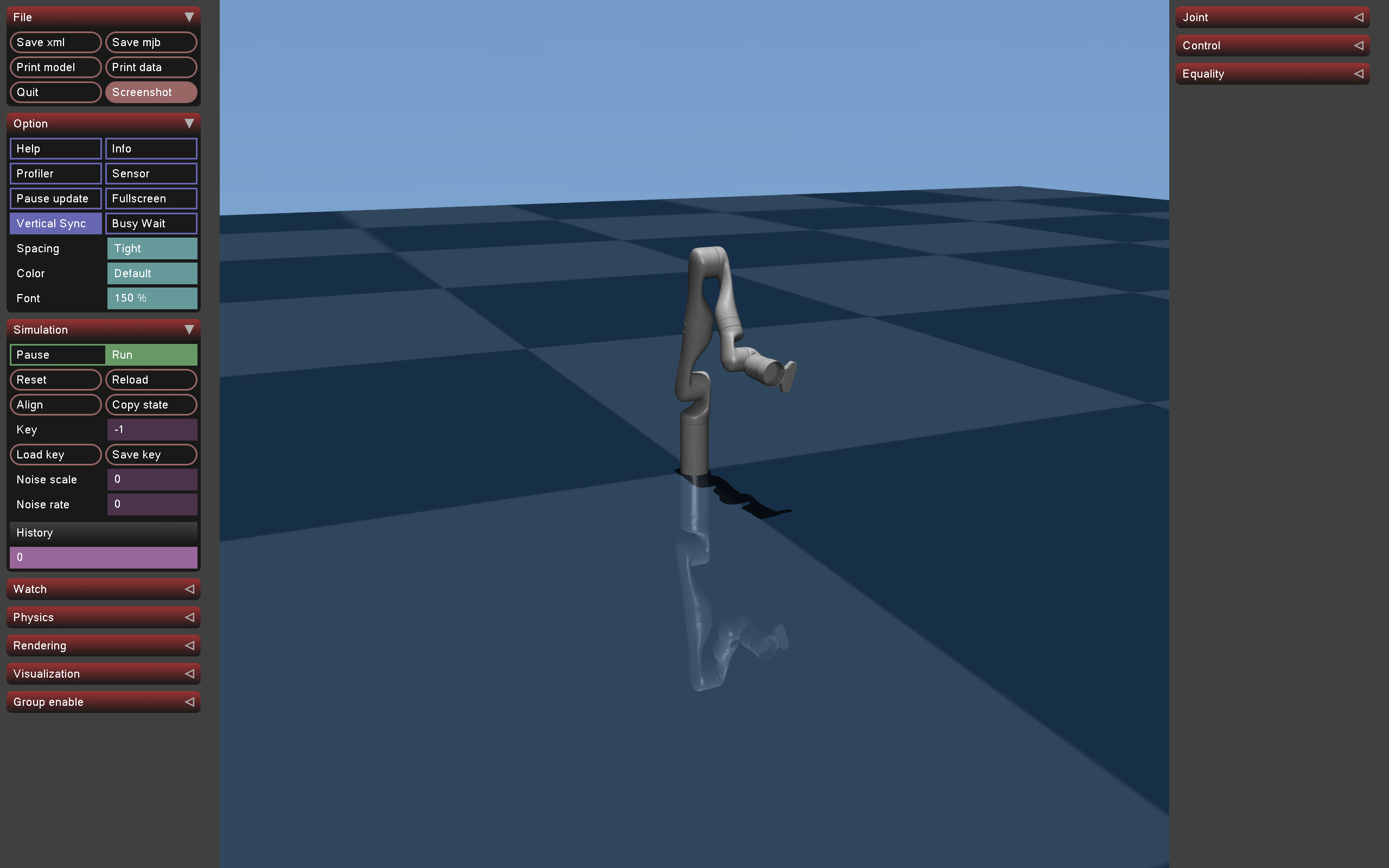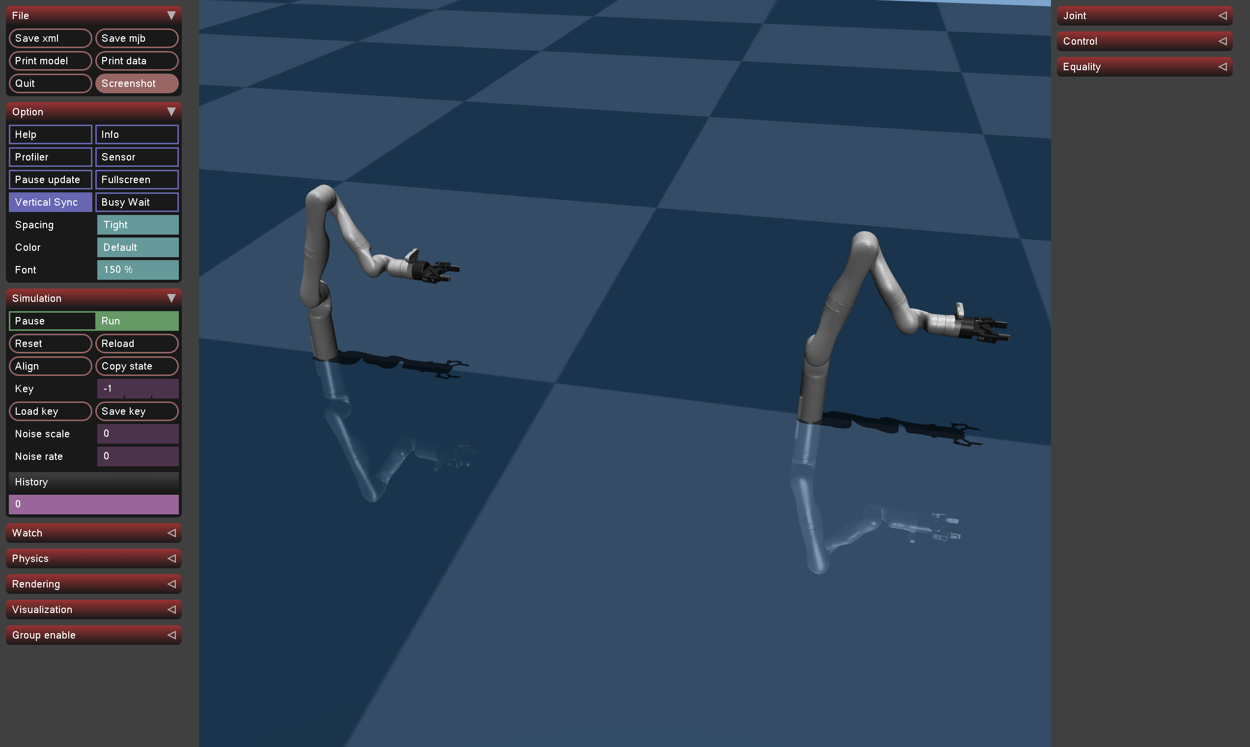 All other controls (reset, quit, rendering flags) are in the MuJoCo left panel.
